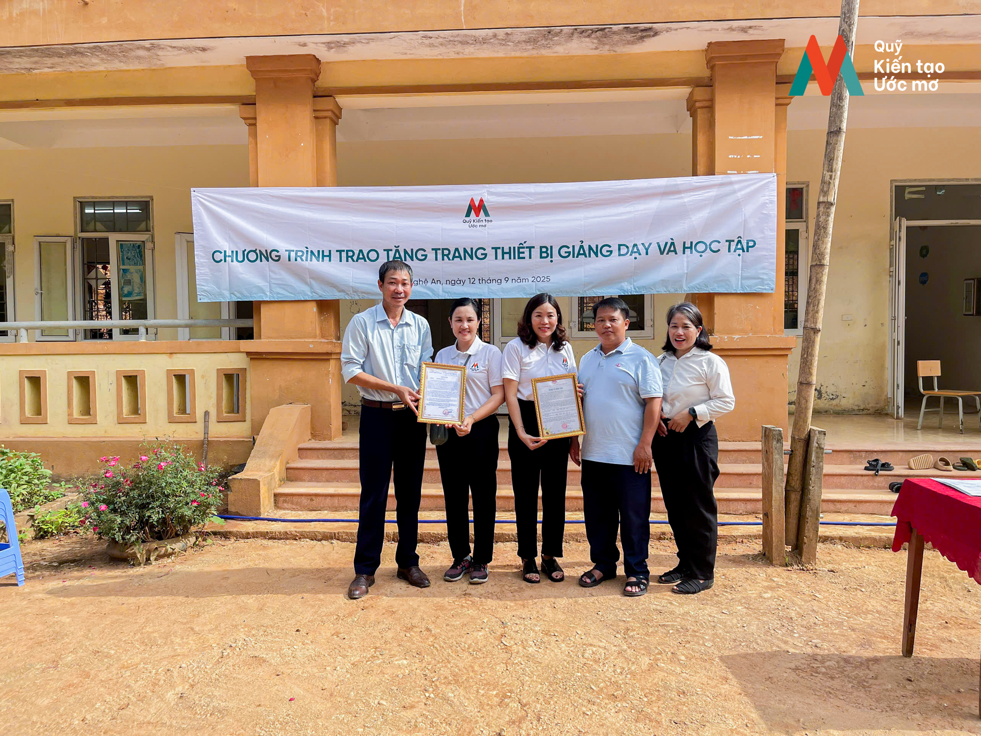Trong hai ngày 11–12/9/2025, Quỹ Kiến tạo Ước mơ (DMF) đã thực hiện chuyến hành trình ý nghĩa đến năm điểm trường thuộc ba xã Mường Xén, Mỹ Lý và Nhôn Mai (tỉnh Nghệ An), mang theo những phần quà là thiết bị dạy học gửi tặng học sinh vùng sâu, vùng xa.